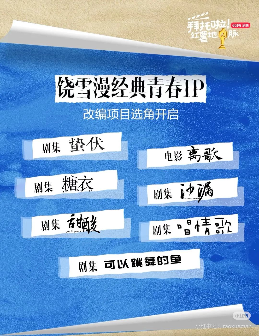 《新声Pro》也观察到,在小红书平台,代表作《左耳》的青春文学作家、编剧饶雪漫自去年9月就开始发起「我给饶雪漫推演员」的话题,为多部青春、轻喜、悬疑类型的新戏开启线上选角工作。目前,该活动已升级为「选角漫直播」,成为账号内常规性直播活动,观播最高在线人数超2.2W。她曾在小红书帖子中表示,自己一直敢于使用新人演员,「她们是我从同年龄段中筛选出最合适角色的人」。无独有偶,今年7月,一部名为《解救牡丹村》的新综艺,其导演也开始在小红书开设直播进行试戏。