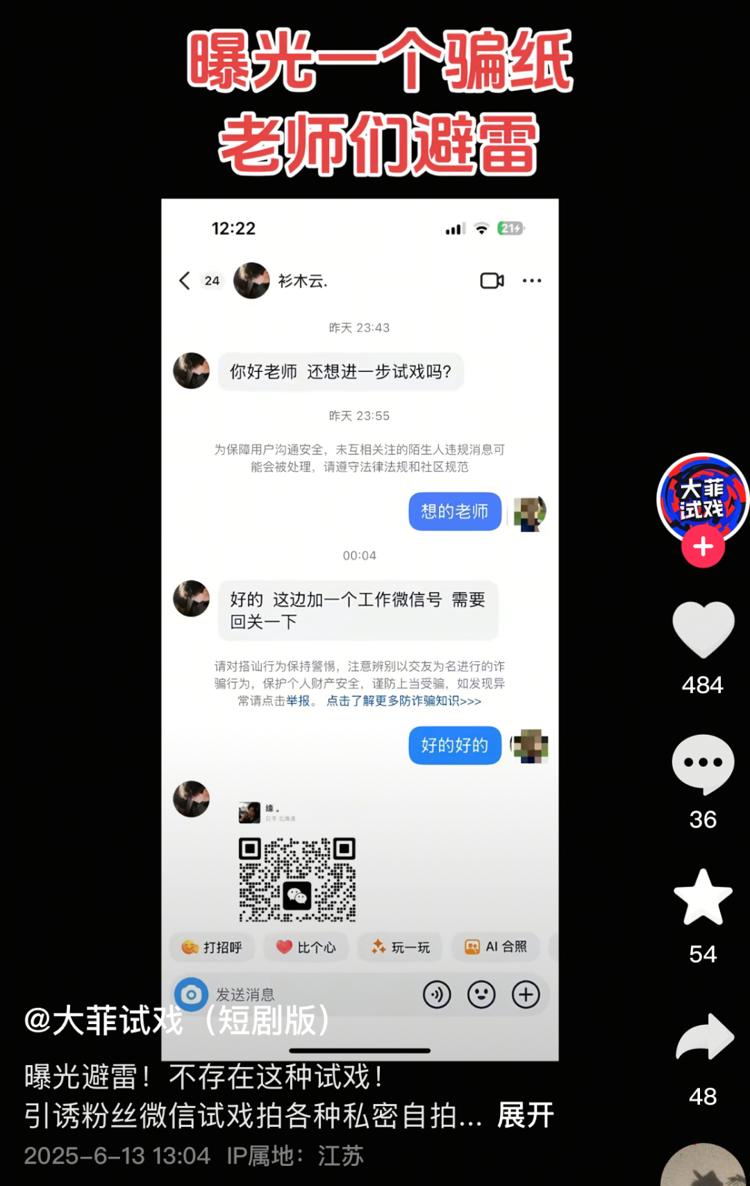 目前的困难是作品输出不够。这段时间我在聊账号运营管理、剪辑的人,想从粉丝里找,他们对账号内容更熟悉、有认同感。另一个烦恼是,有些人进群后接不到戏有点儿不开心。我跟他们说,只是有机会获得资源,但没办法100%孵化。比如素人在上海,想去郑州、西安接戏,那我不敢随便嫁接不认识的资源,怕他们被骗。我精力有限,还没法覆盖全国。