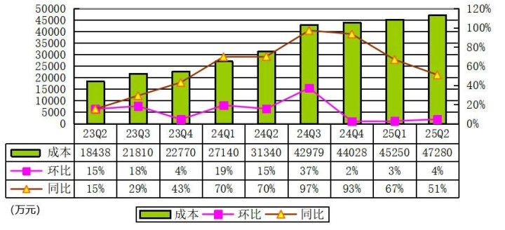 高途2025年第二季度主营业务成本为4.728亿元,较上年同期的3.134亿元增加50.9%,主要是由于主讲老师和二讲老师人数增长带来的人力成本增长,以及房租成本、折旧和摊销费用的增加。